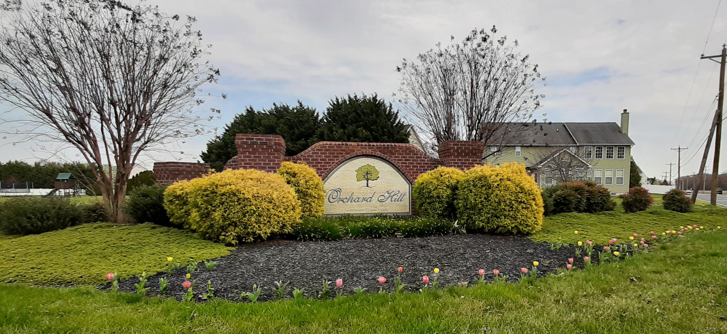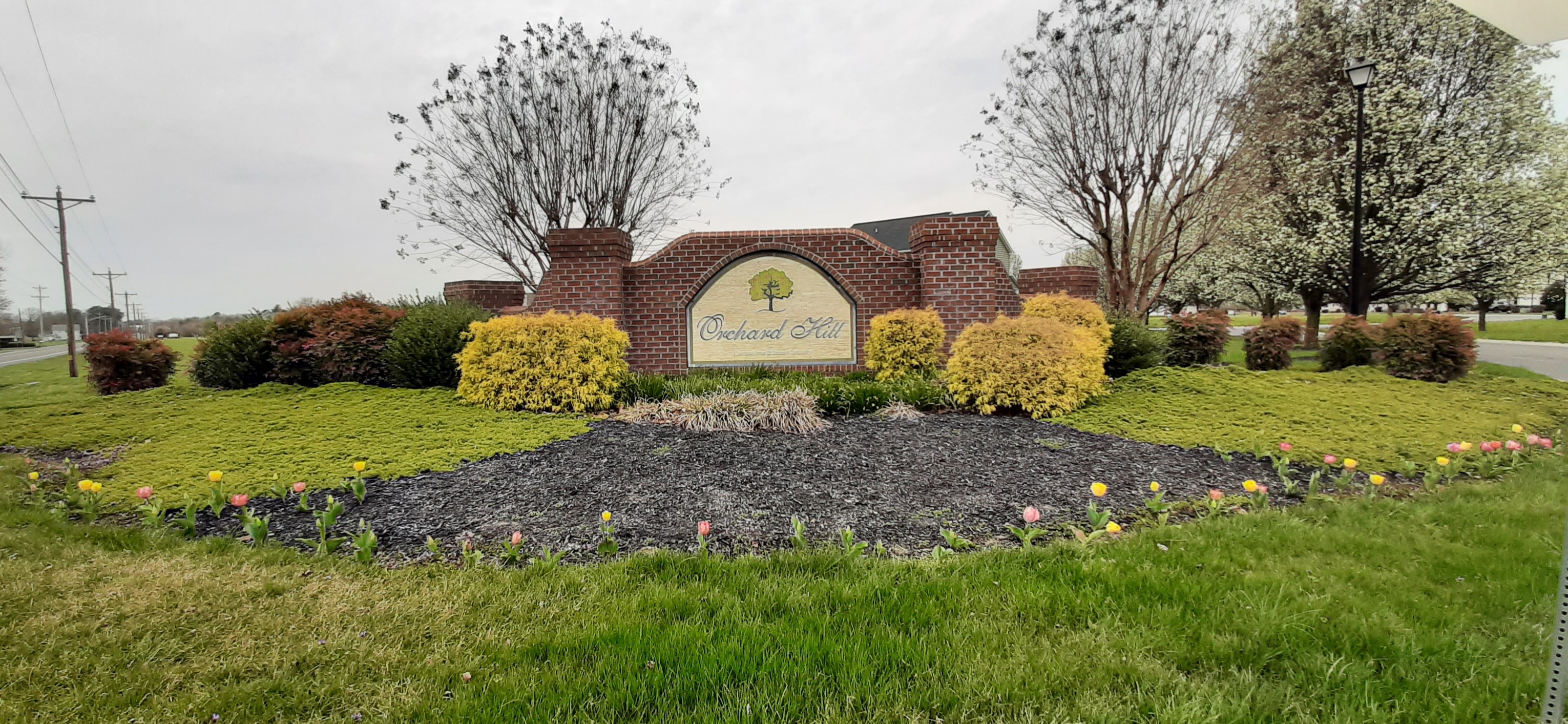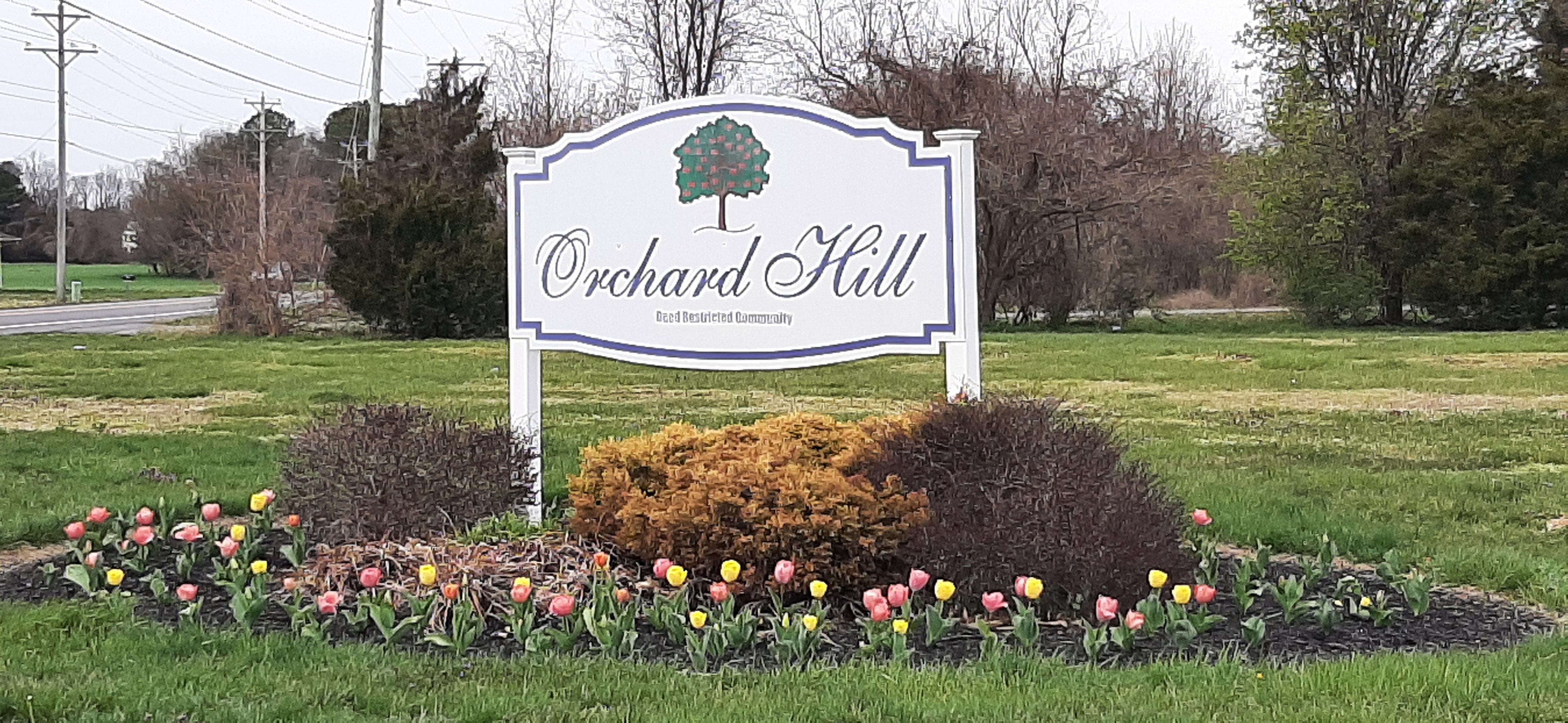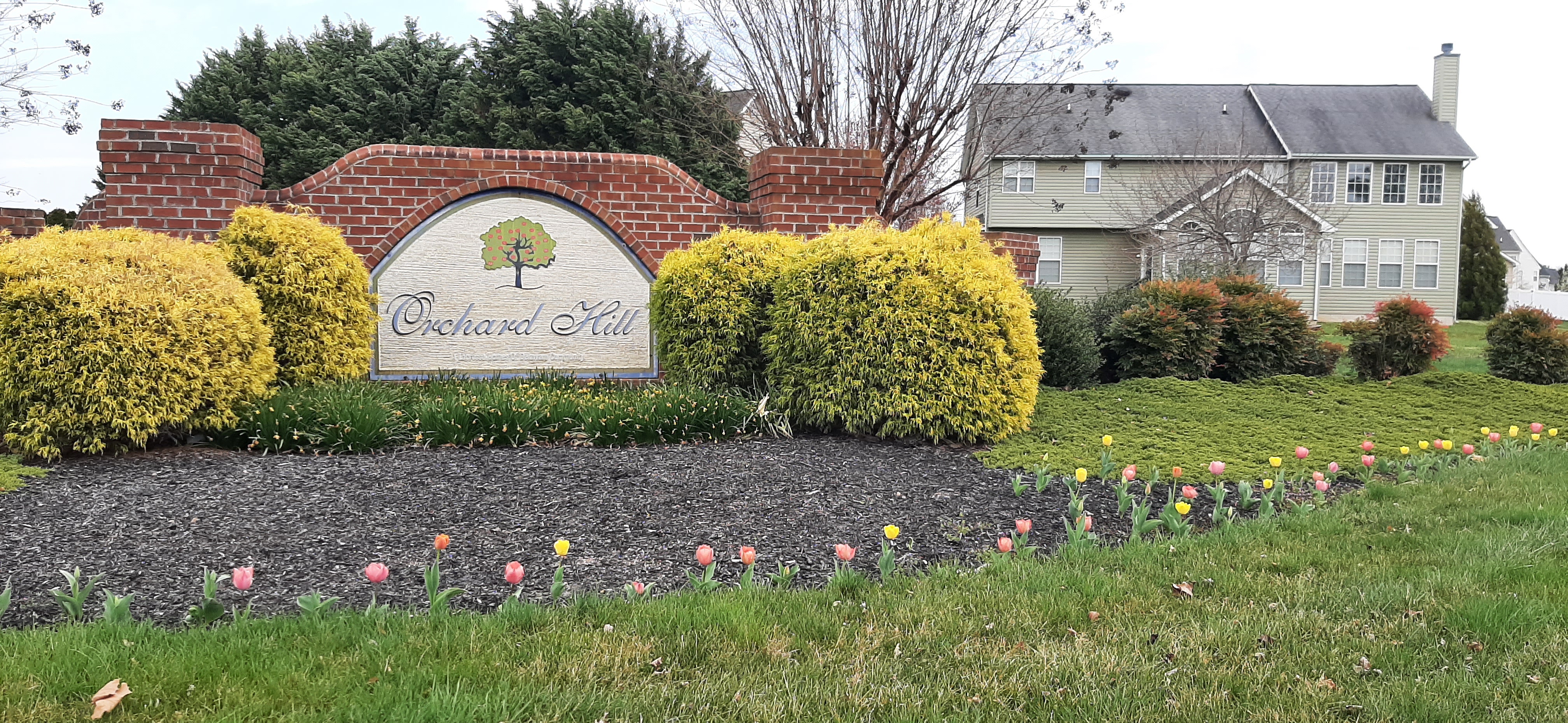 Spring 2023, tulips planted at both entrances by Orchard Hill residents and beautification committee, Patty and Mike Maloney