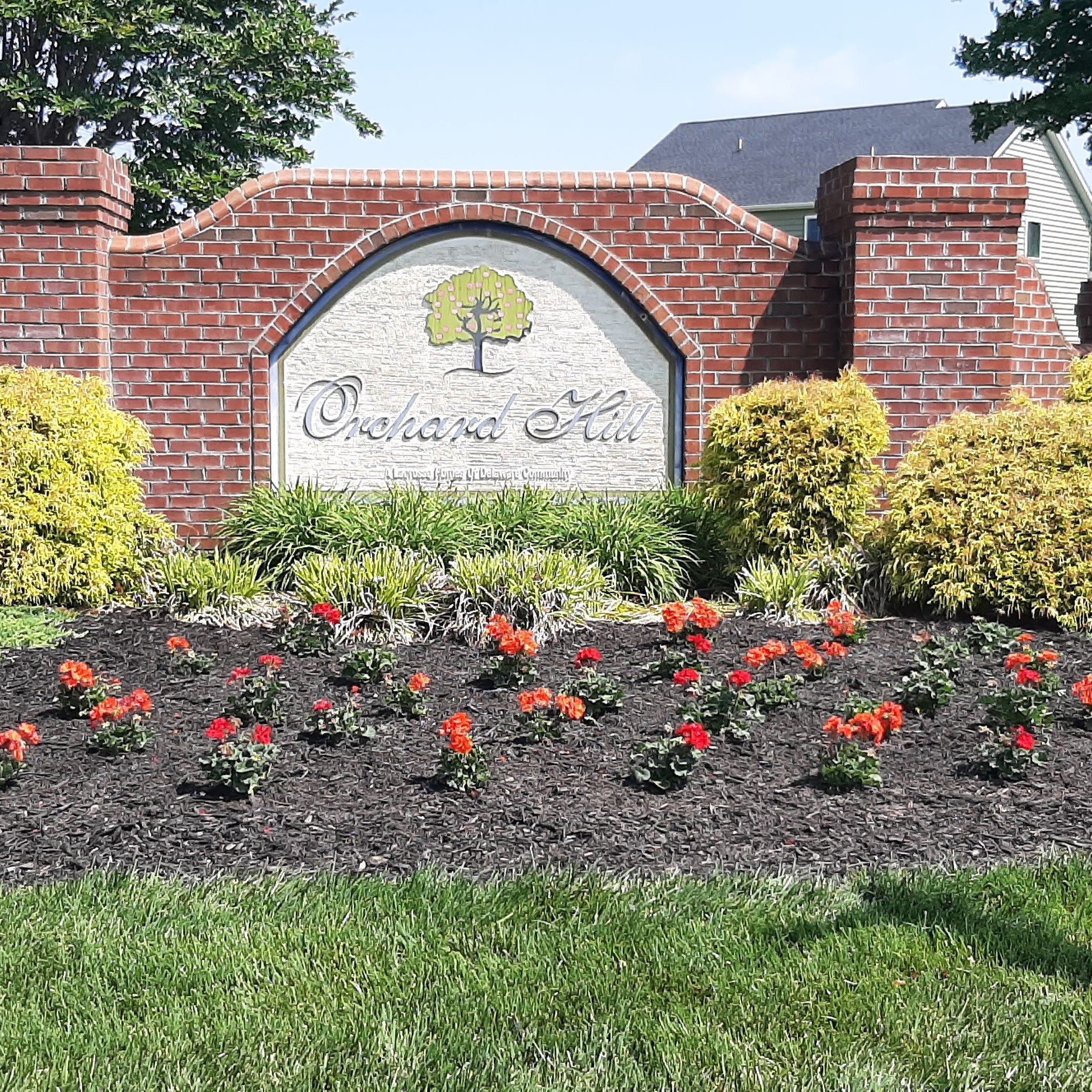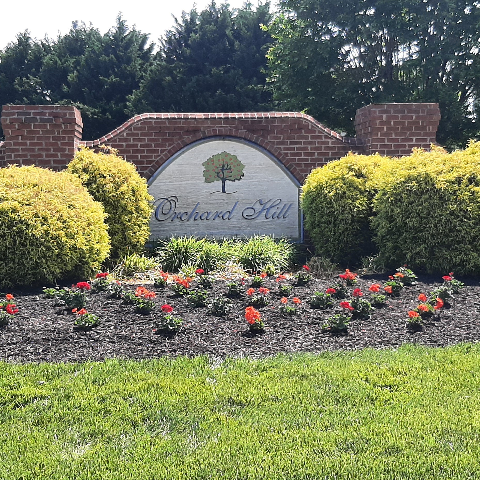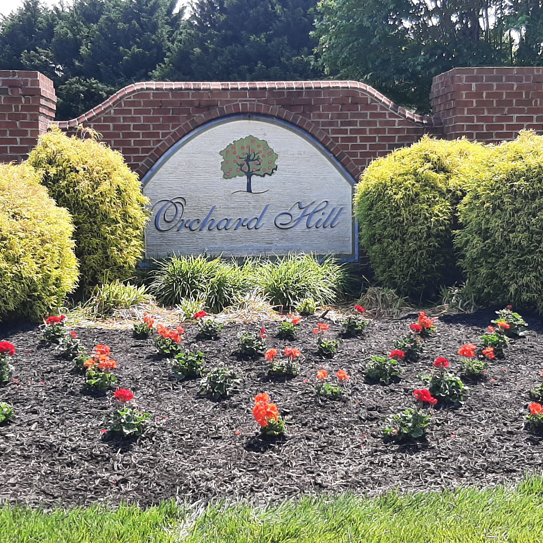 Summer 2023, 80 geraniums planted by a crew of volunteers including Mike & Patty Maloney, Roy & Susan Budsock and Brian Ochs, all Orchard Hill homeowners.